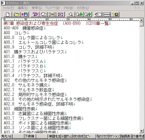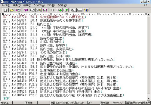 秀丸というのは、Windows3.1時代からあるシェアウェアソフトで、エディタソフトです。ここに行けばお試し版を無料でダウンロードできます。(残念ながらMacintosh版はないようです。)昔、パソコンの性能が今ほど高くなかった頃、ワープロソフト(ワードや一太郎など)の遅さに嫌気がさした人々は、エディタで文章を書いていたものです。エディタにはきれいに文字飾りをつけたり、絵や表を入れたり、フォントを変えたり、書式を整えて印刷したりする機能はありません。できることは単に文章を入力することだけです。そのかわり非常に高速に起動し、軽快に動きます。大量の文章を書くときは、まずエディタで書いて、最後にワープロソフトに読み込ませて、書式を整える人も多いです。(僕もそうです。)しかし、今はあまりにもパソコンの性能が上がったので、直接ワープロソフトで、メモ書き程度から大量の文書作成まで、問題なくできてしまいます。それはさておき、秀丸には正規表現を使った検索機能があります。前夜で書いたICD-10コードのテキストデータ(ICD-10.txt)を秀丸で開き、この検索機能を使って見ました。まず「ICD10.txt」を秀丸で読み込みます。