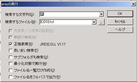最初のところで「grepの実行」でなく、「検索」→「検索」を選ぶと上記のダイアログが開く。ここに同じように「.*脳.*.*出血.*」と入力すると、抽出ではなく、該当する行が一行ずつ表示されます。 |