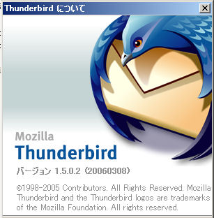 僕は今まで、e-mailソフトとして、Windows標準のOutlookしか使ったことがありませんでした。しかし、Outlookは時々、挙動不審なことがありますし、メールが相手先に届かないことも、その逆もたまにあります。そこで、最近(平成18年3月)新たに、メールソフトとセカンドメールを導入することにしました。つまり、異なるメールアドレスを異なるメーラーで送受信することで、トラブルを避けようと考えました。僕は現在、So-netとニフティの2つのプロバイダに入っています。So-netで1つ(自分用)アドレスを取得し、ニフティで3つ(奥さんと二人の子供用)アドレスを取得しています。今回ニフティの4つめのアドレスを自分用に取得しました。つまり、プロバイダを別にしてトラブルの確率を減らす作戦です。さらにメールソフトも別にして、より安全性を高めようと思いました。さて、メールソフトですが、フリーソフトでいくつか試しましたが、使いにくいものが多く、結局「サンダーバード」というフリーのメールソフトにたどりつきました。これはMozilla Japanという組織が作って(?)いるらしく、昔のNetscapeの後継みたいです。最新バージョンは、Mozilla Thunderbird 1.5らしく、次のURLに行くと、無料でダウンロードできます。