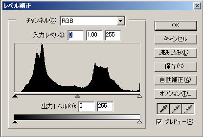 | ヒストグラムが表示されますので、一番右の白い三角を少しずつ左へ動かすと、明るくなります。この3つの三角を適当に動かすことで、露出補正が可能です。いろいろ試行錯誤してみてください。 | 少し逆光気味だったので、明るくしてみました。あとは、ファイル→別名で保存を選択し、適当な名前を付けて保存します。できれば、日本語でなく、半角英数字(できれば小文字)8文字以内で名前を付けることをおすすめします。保存形式 はJPEGとしましょう。 |