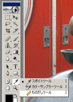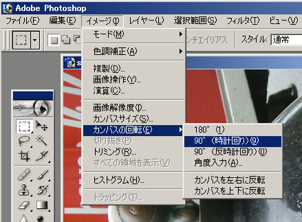 | まず、時計回りに90度回転させます。イメージ→カンバスの回転→90°とします。 | 次に、わずかな傾きをきちんとした水平に直します。ツールバーのスポイドアイコンの上で右クリックし、ものさしツールを選択します。 |