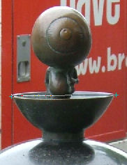 それはともかくとして、境港駅から伸びる水木しげるロードのあちこちでは、100体くらいの妖怪のブロンズ像が置かれています。妖怪神社、妖怪記念館などもあります。そして、何よりも一般商店が独自に妖怪のデコレーションを飾っており、シニアには楽しめることうけあいです。駅の正面には、さっそく水木しげると、ネズミ男と鬼太郎と目玉親父のブロンズ像があり、街灯は目玉親父の形をしています。そういうブロンズ像の中で、目玉親父を撮影してきました。この写真は200万画素相当で撮影されており、従って1600×1200ピクセルの画像です。この写真のまわりの余分な背景を削除して、1200×900の画像にしてみます。ついでに、傾きや露出も少し補正してみます。