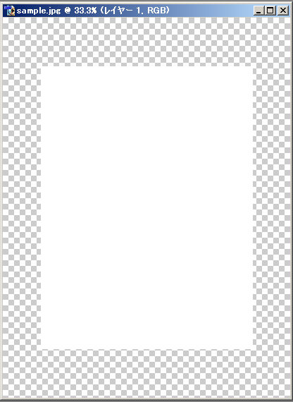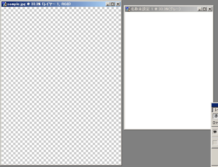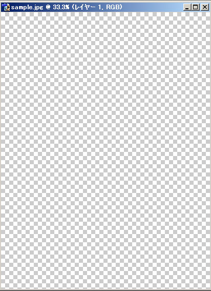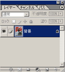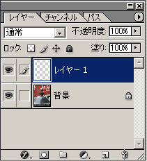 | レイヤーウィンドゥにレイヤーが追加されました。 | レイヤーウインドウで、背景レイヤーの行の、一番左にある目のマークを消すと、レイヤー1のみが表示されます。この状態を仮にAとしておきます。 |