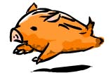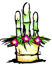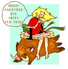 筆まめなどの、最近の年賀状作成ソフトは、PNGの透明背景をきちんと認識できます。ですので、まず画像@を読み込み、次に画像Aを5個読み込み、最後に画像Bを1個読み込むことによって、次のような絵を作ることができます。 |