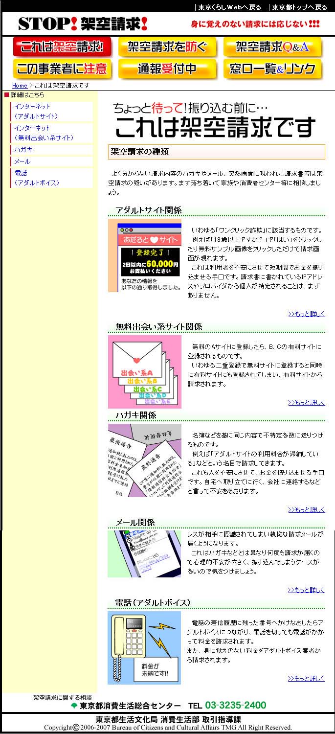 架空請求という詐欺をよく見かけます。電子メールに載っていたURLをクリックしたら、強制的に契約したことになって、その後、頻繁に料金催促のメールが届くというのを最近経験しました。調べたところ、架空請求という詐欺には、上記以外にも、いくつかのパターンがあるそうです。パソコンを使ったものから、携帯電話を使ったものまでいろいろです。東京都消費生活総合センターというサイトに、詳しい詐欺の手口が載っています。