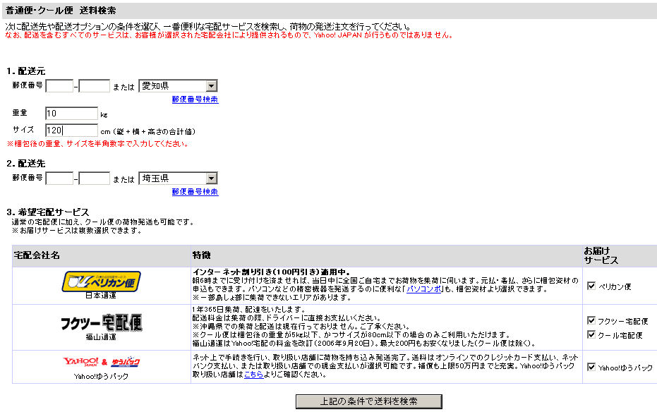 送り元と宛先、荷物の重量、サイズを入力し、「上記の条件で送料を検索」をクリックします。 |
