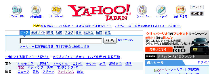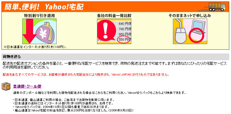 Yahoo!ゆうパックを使ったことがない方も見えると思います。別に僕はYahoo!の回し者ではありませんが、少し実際の使い方を説明させていただきます。2007年6月25日現在のYahoo!Japanのトップページは次のようになっています。 |