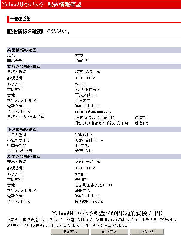実際には、送り主情報欄に、Yahoo!JAPAN ID登録時のデータが自動入力されています。荷物の重量と3辺の合計(cm)、宛先情報を入力します。なお、宛先の電話番号は必須です。宛先の電話番号を入力しないと、発送できないのでご注意下さい。入力が終わったら、「次へ」をクリックすると、下記のように料金が表示されます。(これは、仮の宛先と送り主を入力したサンプルです。実際の住所や電話番号ではありません。) |