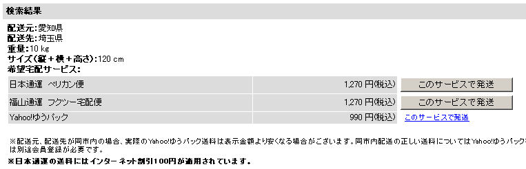 一番安い、業者の「このサービスで発送」をクリックします。ここではYahoo!ゆうパックが最安なので、それをクリックします。 |