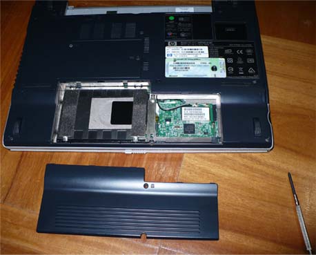 フタを慎重にはずす。(硬いので、プラスチックを傷つけないように。)左側に、ケースに入った2.5インチ、40GBのHDDが入っています。 (左下に写っているのがドライバです。) |