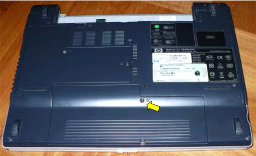 バッテリーの反対側にHDDの入っているスペース(HDDボックス)があります。矢印のネジをはずします。少し小さめのネジなので、小さなドライバが必要です。 |