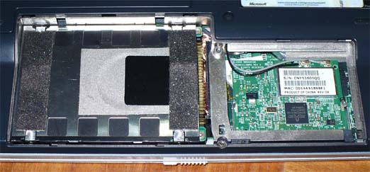 後は、取り外したのと反対の手順で、新しいHDDを組み立てて下さい。使われているのは、2.5インチ、9.5mm厚、通常電圧のHDDですので、汎用品が使えます。僕は80GBのHDDを使いました。 |