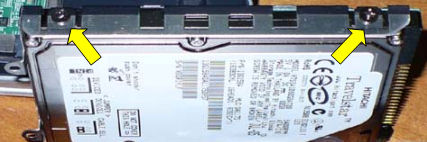 HDDはカバーに入って、4つのネジで固定されています。これをはずします。 (矢印は、手前の2つのネジです。反対側にも2つネジがあります。) |