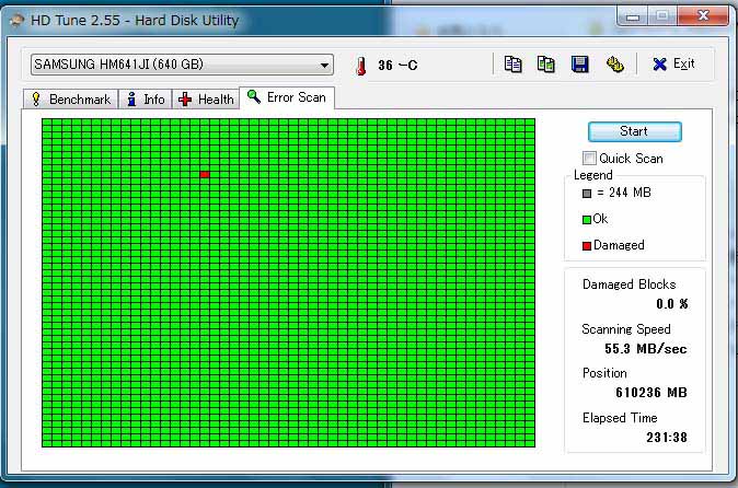 後で、HDDのエラーチェックを実行したところ、エラーが見つかりました。 どうも、物理的なエラーでクラッシュしたようです。 復帰したのはかなり幸運でした。換装前のHD TUNE 2.55というフリーソフトを使ったエラーチェック画像を示します。