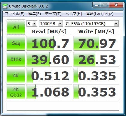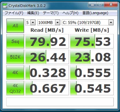 まず、CrystalDiskMarkというフリーソフトを使って、HDDへのアクセス速度を計測しました。