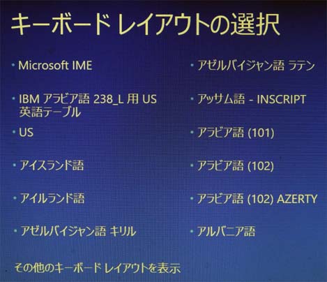 最初に、キーボードレイアウトの選択画面が出ます。普通、Microsoft IMEを選択します。 |