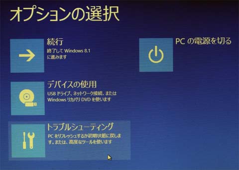 今、やりたいことは、バックアップからのレストアですので、「トラブルシューティング」を選びます。 |
