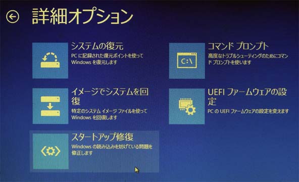 最後に、回復ドライブから起動したときの、メニュー画面を写真に撮ったので、掲示しておきます。