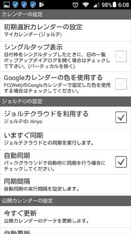 これで設定は終了です。 5. の画面で、「自動同期」にもチェックを入れておいたので、今後、新規予定を入れるとジョルテ・クラウドと自動的にリンクするようになりました。 |