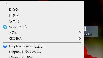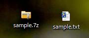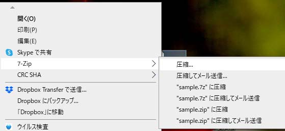 使い方を説明します。デスクトップに「sample.txt」というファイルを置きます(図1)。(中身は「sample.txt」という文字列が入っています。)7-Zipがインストールされた状態で、このファイルを右クリックすると、次のメニューが開きます(図2)。7-Zipという項目を選ぶと、右側にメニューが追加されるので、一番上の「圧縮」を選びます(図3)。すると、図4のようなメニュー画面が出るので、パスワード入力とパスワード再入力の窓に好きな(覚えやすい)文字列を入力します。(パスワードを表示ボックスにチェックを入れると、入力した文字列を確認できます。)(ここでは、「sample」という文字列を入力しています。)最後に、「OK」を押すと、圧縮ファイルが元のデータと同じ場所に作られます。作られた圧縮ファイルが図5です。
