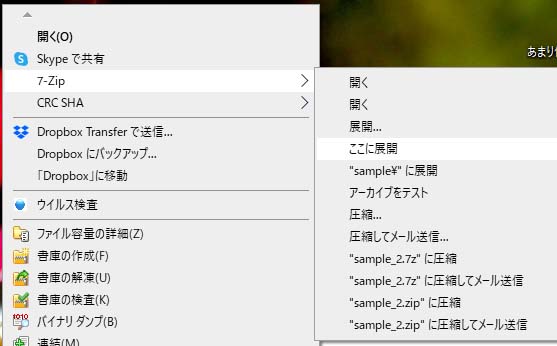 解凍方法ですが、先ほど作った「sample.7-z」ファイル上で右クリックすると、図6のようなメニュー画面が開きます。「ここに展開」を選ぶと、図7のようなパスワード入力を求める画面が開きます。先ほど圧縮時に設定した「sample「という文字列を入力します。「OK」をクリックすると、図8のように、解凍されたファイルが出来上がります。