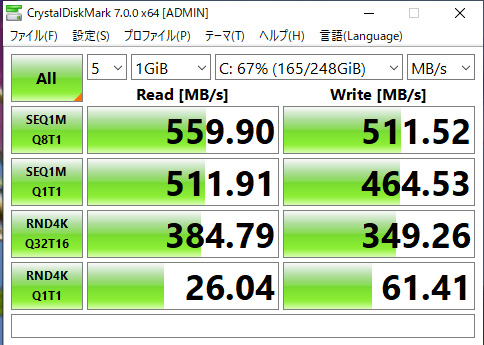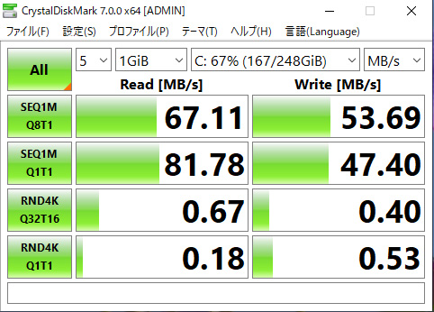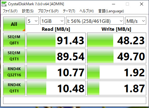ダイナブックに刺してある、512GBのSD-XCカードとの読み書きの速度です。 内蔵HDD(左)よりも高速なので驚きました。 |