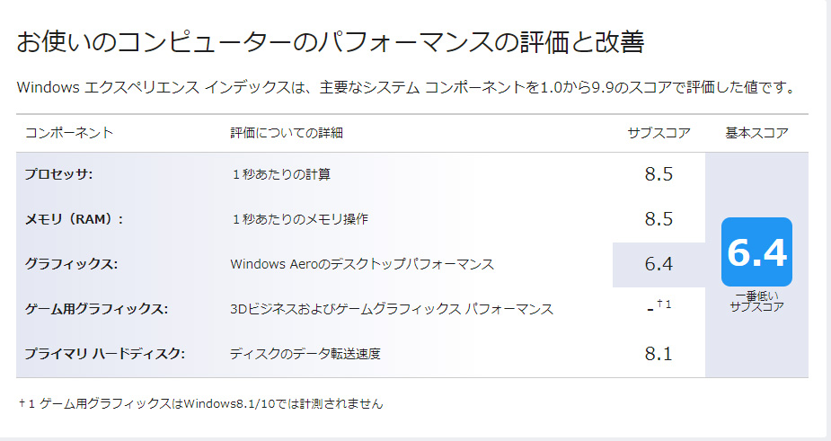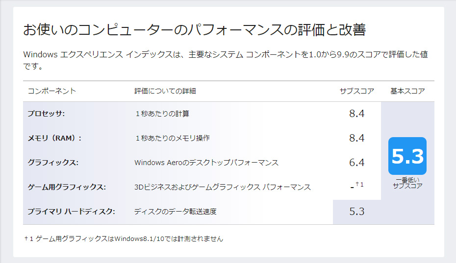 ダイナブックのHHDをSSDに換装後のエクスペリエンス・インデックスです。プライマリー・ハードディスクのスコアが上がり、グラフィックスが最低スコアに変わりました。 |