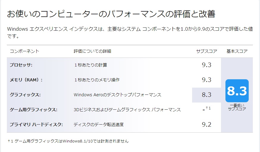 参考として、先日購入したRysen-7搭載のデスクトップPCでもエクスペリエンス・インデックスを計測してみました。さすがに高スコアです。僕が今回購入したSSDカードと、デスクトップPCに搭載されているM.2 SSDとの速度差が示されていて、興味深いです。 |