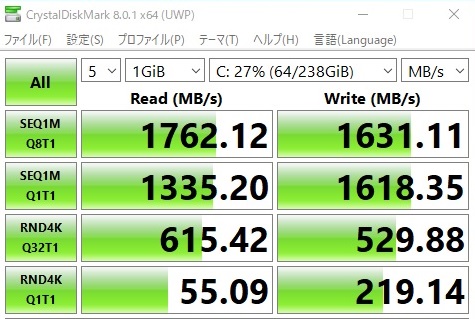 最後に、SSDを換装したので、Crystal Disk Markで転送速度を計測しました。その結果は下図の通りとなっています。