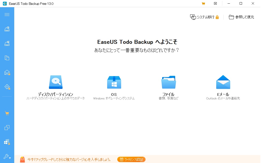 まず、「EaseUS Todo Backup」というフリーソフトをダウンロードして、デスクトップPCにインストールします。 無料版で良いので、その時点での最新バージョンをインストールします。(僕がダウンロードした時の最新バージョンはver.13でした。)起動する前に、クローンを作りた いストレージを外付けドライブにして、PCに接続し、 PCから認識できるようにしておきます。今回の場合は、昨夜紹介した1TBのM.2 SSDをエンクロージャに入れたものをデスクトップPCのUSB端子に刺し、PCから認識できていることを確認しておきます。その後、「EaseUS Todo Backup」を起動すると次のメイン メニューが起動します。左上にバージョン番号が表示されています。