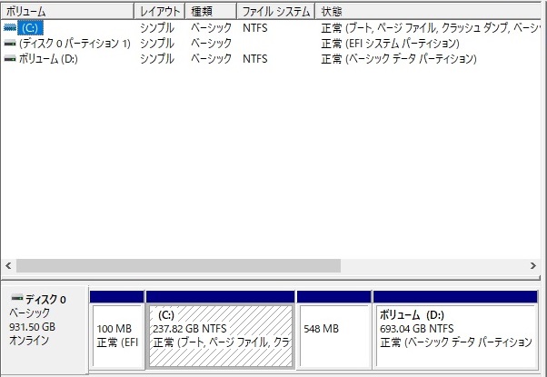起動直後は、上の図のボリューム(D:)の部分が、「未割当て」となっていました。そこで、右クリックしてパーティションを作成し、NTFS フォーマットしたところ、上の図のように、693.04GBのDドライブができました。換装前は256GBでしたから、ずいぶん容量が増えました。なお、 CドライブとDドライブの間に、548GBの謎のスペースが表示されています。これも削除してDドライブに加えることも考えましたが、回復ドライブとし て、万一の時に役に立つのかもしれないと思いなおし、そのまま残してあります。
