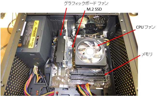 よっぽどCPUやグラフィックボード(ビデオカード)の発熱が大きいらしく、 巨大なファンがついていて驚きました。一方、昔のデスクトップPCで大きなスペースを占めていたハードディスクドライブがなくなり、まるでメモリの ような小さなM.2 SSDがあって、自作の世界もずいぶん様変わりしていました。グラフィックボード・ファンとCPUファンの間の大変狭い場所に、M.2 SDDが刺さっており、小さなネジ1本で固定されていました。ネジを外すのは簡単でしたが、狭いので固定するのは大変でした。四苦八苦して何とか 取り付けることができました。