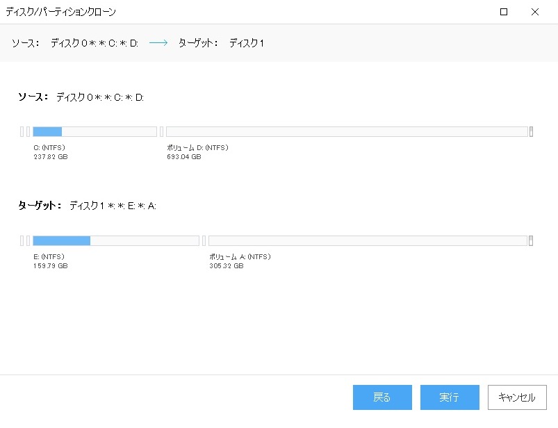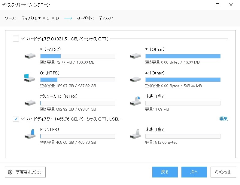 PCに入っているドライブ、つまり、ハードディスク0のチェックボックスにチェックを入れます。これの内容を丸ごと、外付けドライブにコピーします。 当然ですが、コピー先にはコピー元と同じまたはそれ以上の容量が必要になりますので、注意が必要です。なお、このクローン作製操作を実行すると、コピー先 のドライブの中身はすべて消去されます。必要なデータはあらかじめ別の場所に移しておいて下さい。