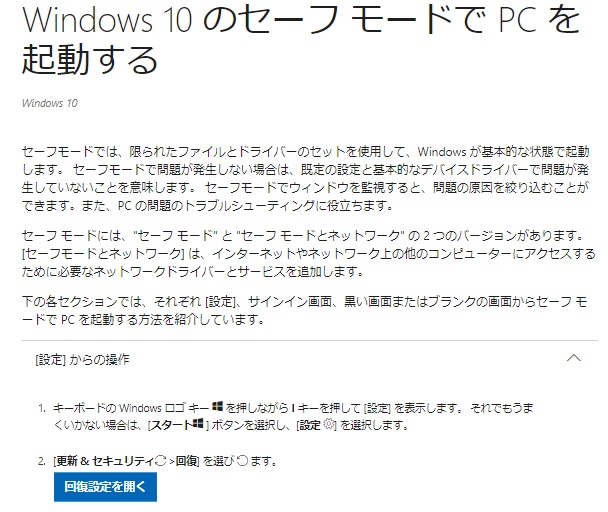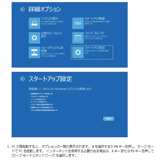 この話は以前にも書いたかもしれませんが、当時は多分Windows 10ではなかったと思います。 (Windows 7か8だった気がします。) 一言で書くと、セーフモードで再起動してからインストールするだけです。 Windows 10のセーフモード再起動方法はマイクロソフトのホームページに詳しく書かれています。 しかし、URLがうまくコピーできなかったので、キャプチャー画面を載せておきます。