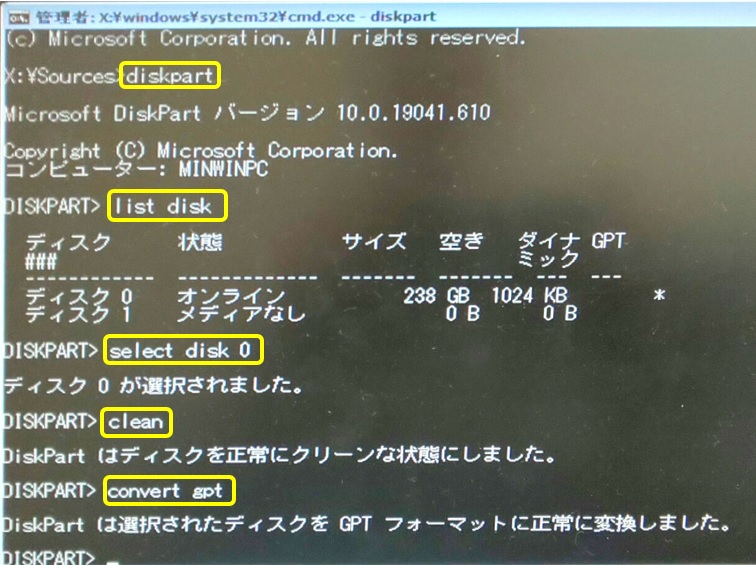 不思議なのは、手順(1)で確かにGPT形式でフォーマットしたはずの場合も同じメッセージが出て先に進みません。