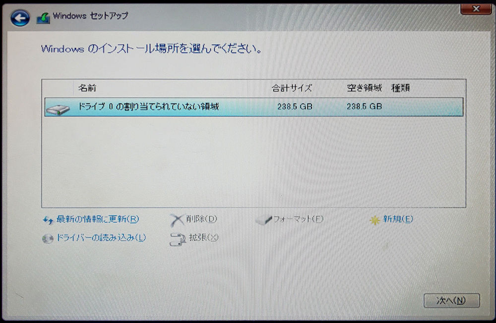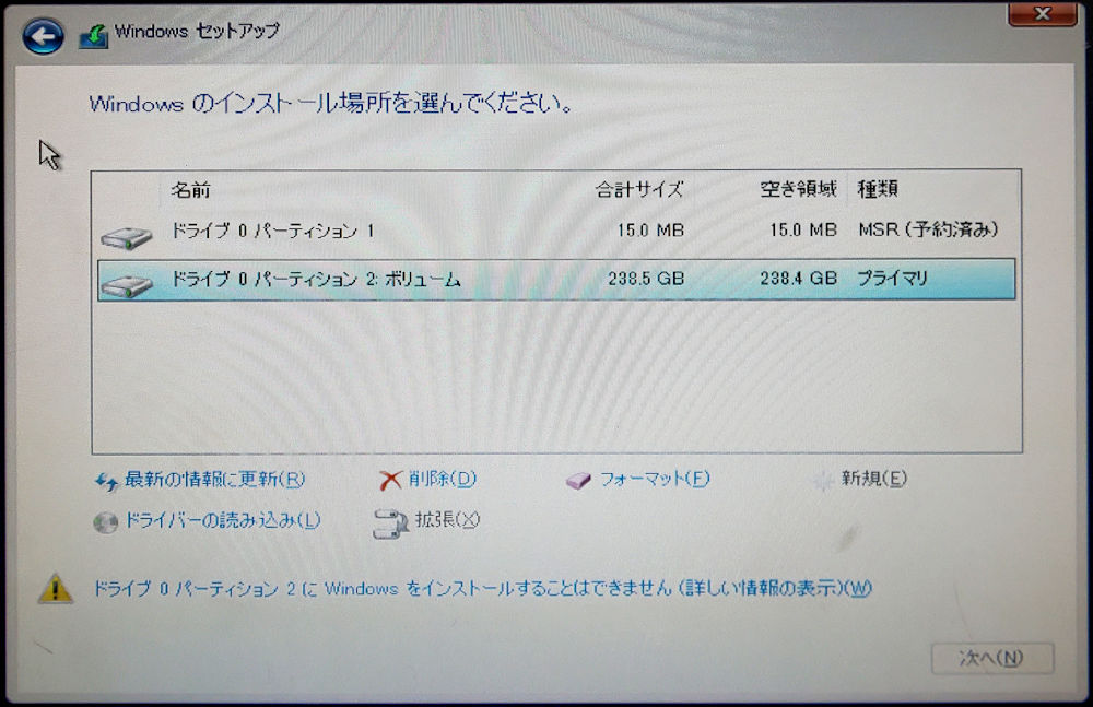 ンストールの途中で、このドライブはGPT形式ではないのでインストールできないという表示が出ます。