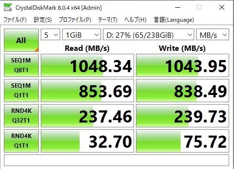 先ほどの結果に比べて読み出し速度が少し遅いですが、まあまあ の転送速度でした。そこで、ノートPC(マウスDAIV)内の250GBくらいのデータを、コピーしてみました。 すると、30分くらいでコピーできました。これくらい高速にコピーできれば待ちくたびれることもありません。しばらくは、この1TB外付けドライブをバックアップ用のドラ イブとして使おうと思います。